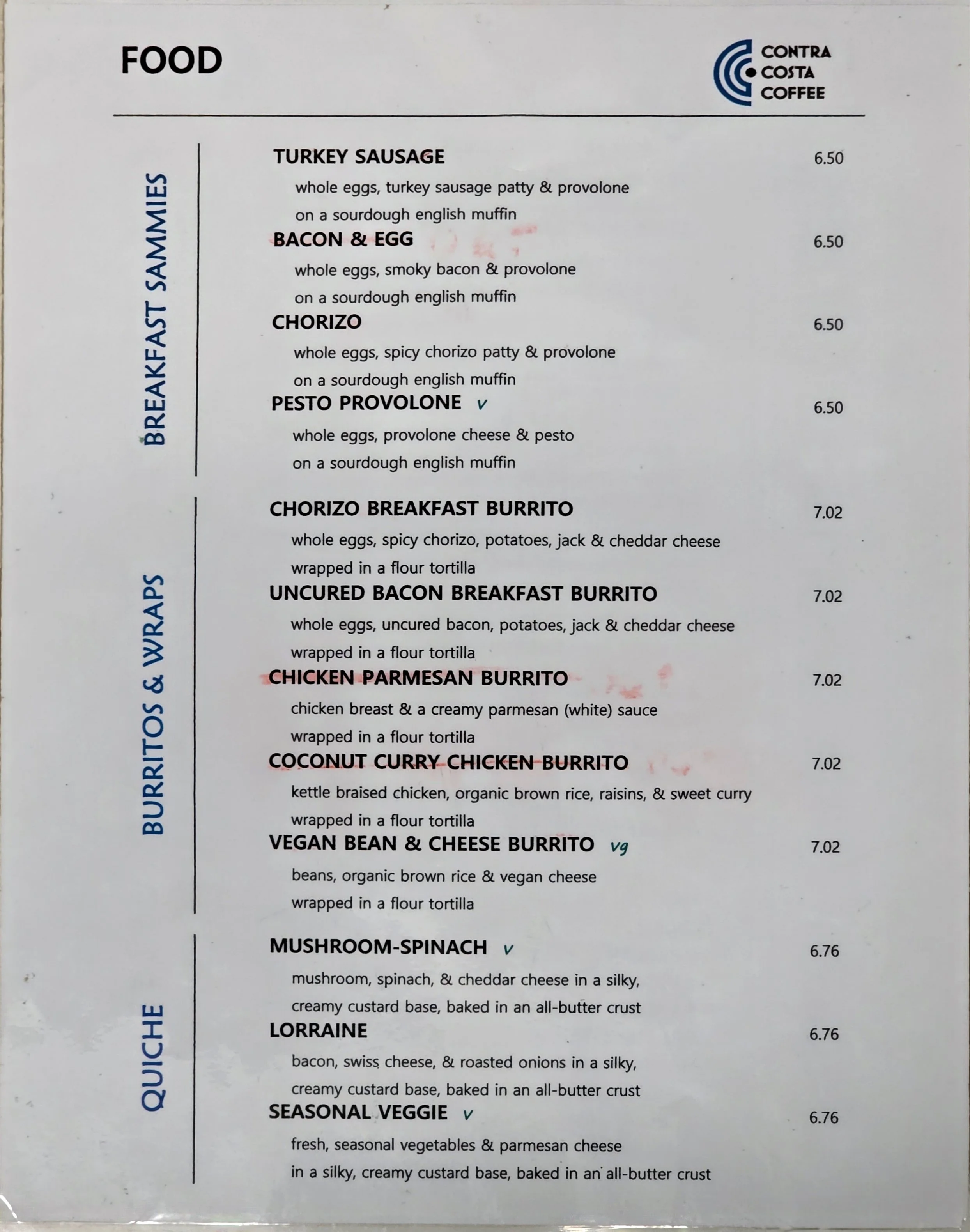 Restaurant menu section titled Food with breakfast sandwiches, burritos, and quickie options listed, including turkey sausage, bacon & egg, chorizo, pesto provolone, chorizo breakfast burrito, uncured bacon breakfast burrito, chicken parmesan burrito, coconut curry chicken burrito, vegan bean & cheese burrito, and lots of other options.